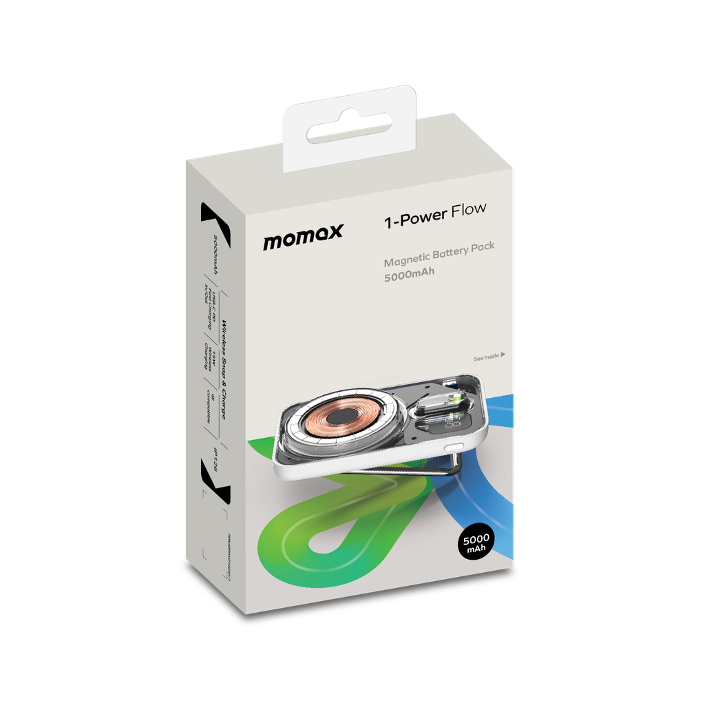 Experience effortless wireless charging with the Momax Flagship Flow Series Magnetic Battery Pack. Designed for instant snap-on charging, this compact and transparent power bank attaches securely to MagSafe-compatible iPhones. Its LED battery display keeps you informed, while the built-in kickstand lets you enjoy hands-free viewing anywhere. Lightweight and travel-friendly, it ensures seamless power backup wherever you go.