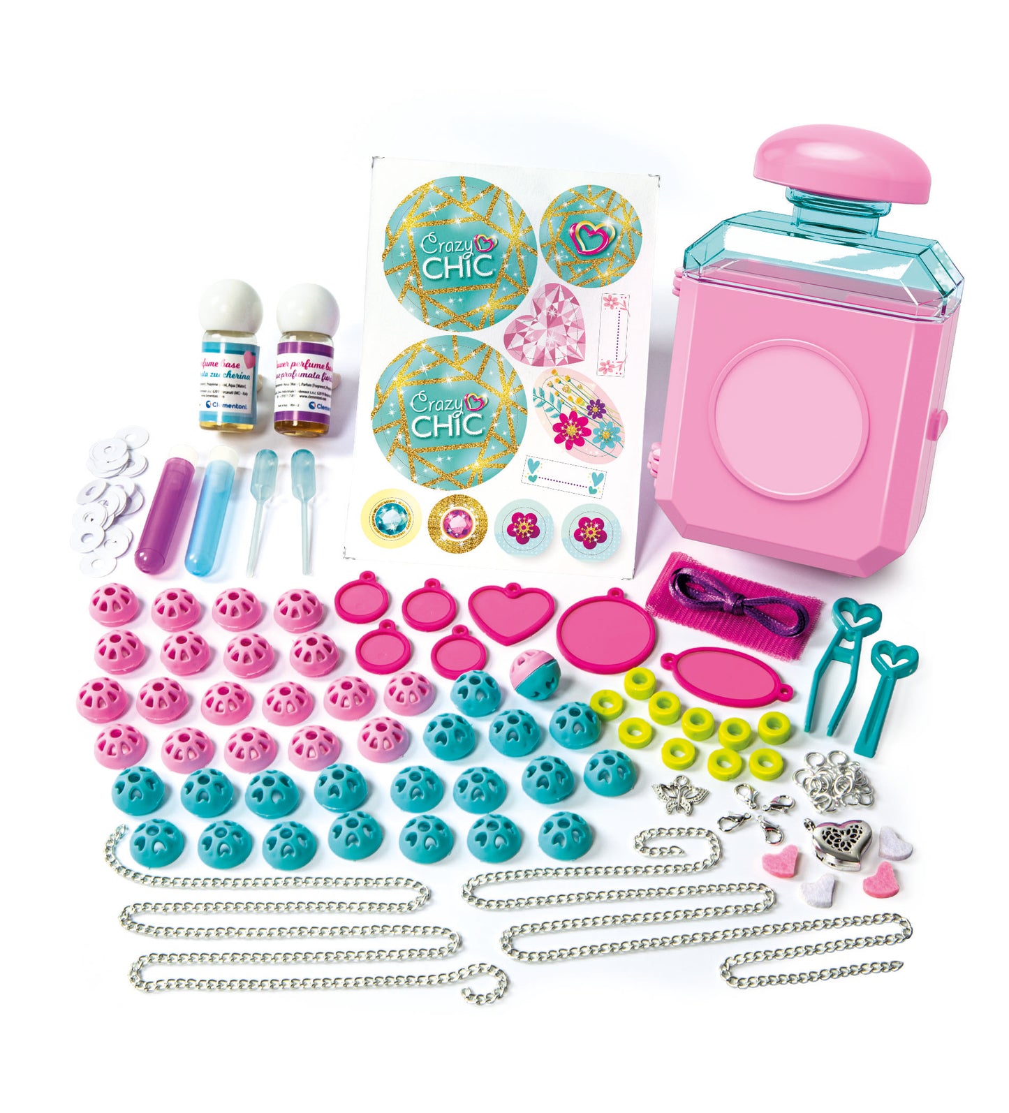 An original bottle-shaped perfume dispenser that contains everything you need to create fragrant Crazy Chic pendants, necklaces and bracelets! Just pour a few drops of perfumed essence onto the absorbent discs and place them inside the pendants and beads to create super-glam-scented jewelry. Develops dexterity and creativity. Recommended for age 8 years old and above. Conceived, designed and developed in Italy.