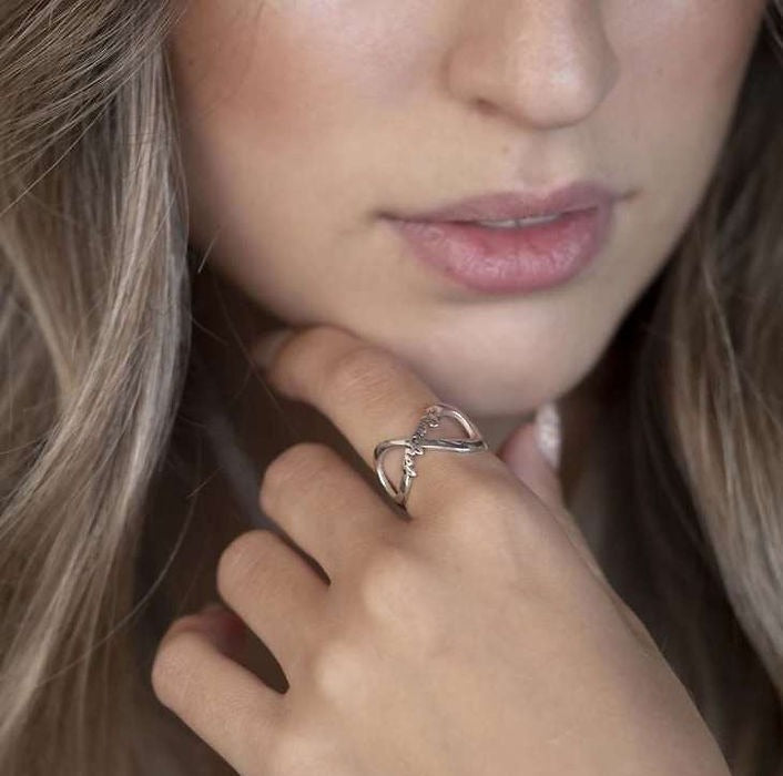 Personalise this elegant infinity name ring in your favourite script. Made from durable, hypoallergenic sterling silver, it’s perfect for daily wear or as a thoughtful gift.