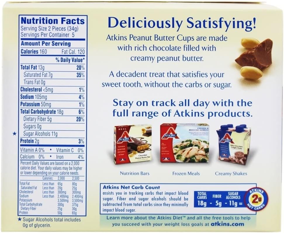 Tastes just like what you’re thinking of, with not one bit of remorse. Creamy milk chocolate flavored cups filled with peanut butter. Atkins peanut butter cups have 1g net carbs and 0g of sugar making them the perfect guilt free treat.