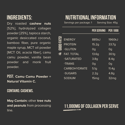 Cashews [61%], grass-fed collagen [25%], tapioca starch, pure organic maple syrup, MCT oil powder (MCT Oil, acacia fiber), camu camu, vanilla bean powder and monk fruit.
