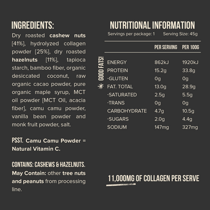 Nuts (cashews [46%] and hazelnuts [11%]), grass-fed collagen [25%], tapioca starch, raw organic cacao, pure organic maple syrup, MCT oil powder (MCT oil, acacia fiber), camu camu, Himalayan salt, vanilla bean powder, monk fruit.