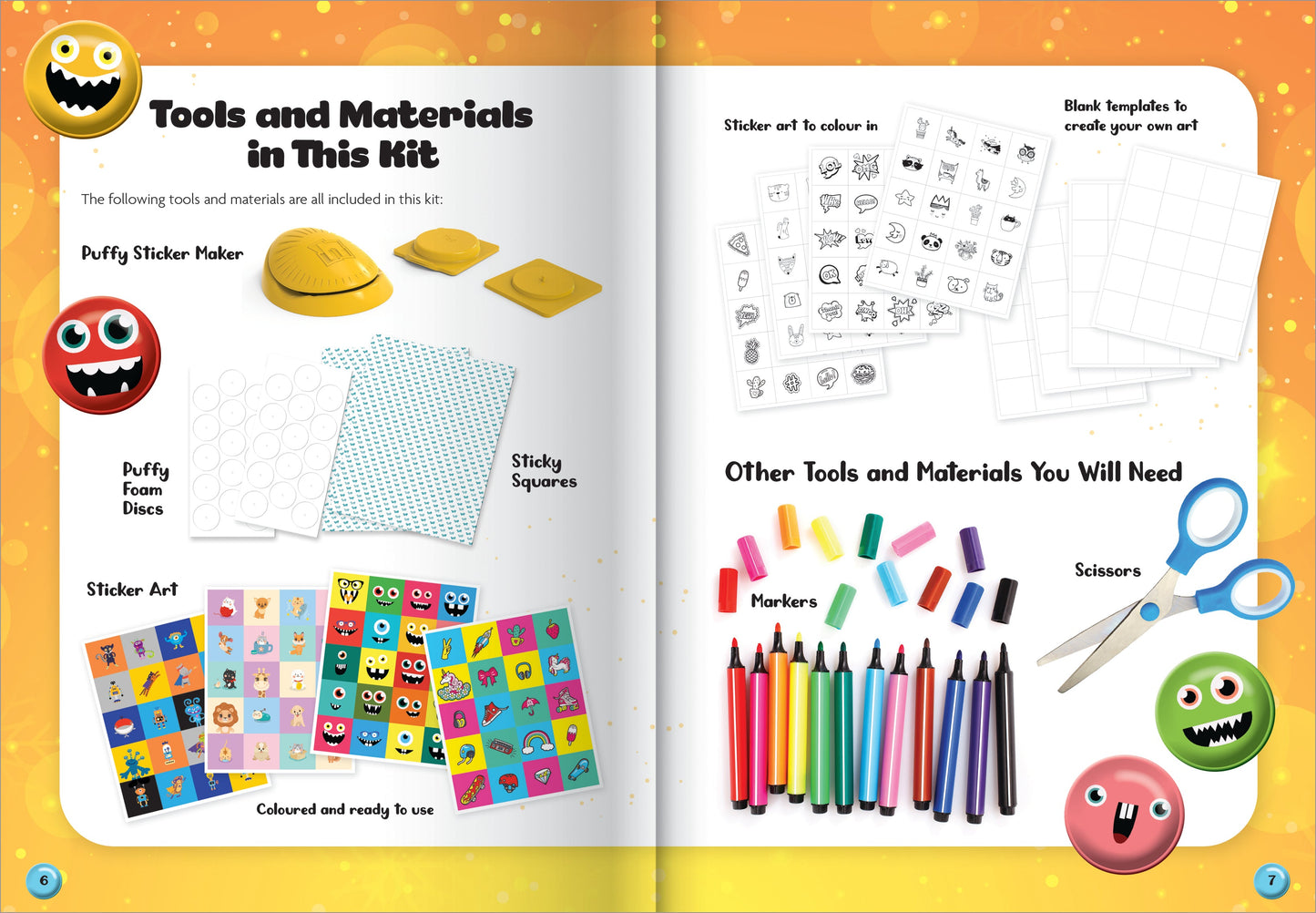 The 48-page book features detailed step-by-step instructions for using your puffy sticker maker, plus 12 pages of perforated sticker artwork to choose from: funky pre-colored designs, line art to color yourself, or simple blank templates to draw and design your own unique artwork!
