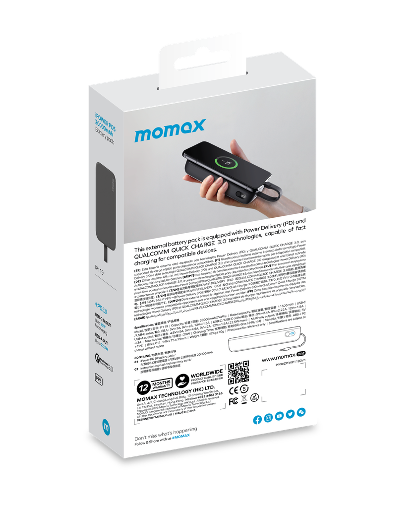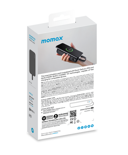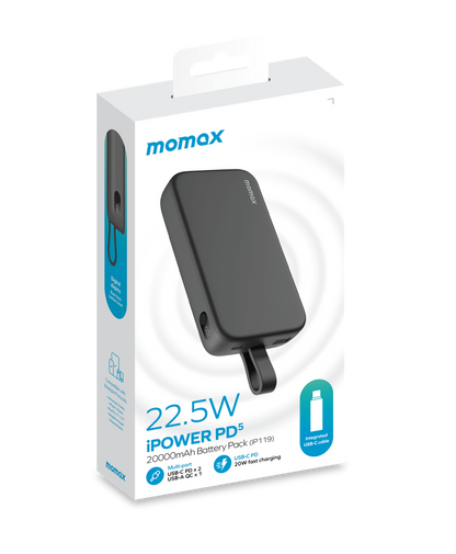Stay powered on the go with the Momax 20,000mAh power bank, featuring a built-in USB-C charging cable, USB-C and USB-A ports, and fast charging support (PD 20W & USB-A 22.5W). The digital display shows real-time battery status, while multiple safety protections ensure reliable and secure charging.