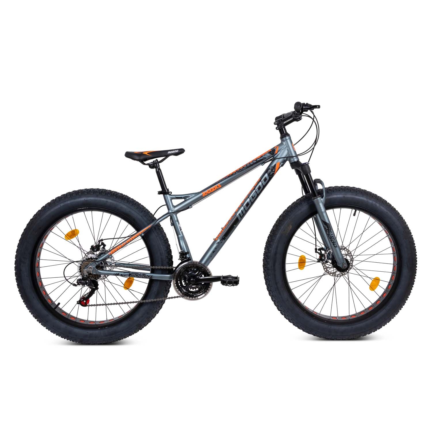 The Mogoo Joggers 26" provides off-road capabilities and everyday riding performance for the ultimate biking experience. The 26" x 4" knobby tires give you enhanced stability when conquering different types of terrain, and the extra width helps handle bumps and obstacles in the road. Dual disc brakes help you stop safely, even in wet and hazardous conditions, and the seven-speed rear derailleur is highly responsive, changing gears to tackle hills and other inclines is no problem with Joggers.
