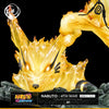 Heading straight towards Obito, who has become invulnerable as Juubi’s receptacle, we see here Naruto - 4th War Ikigai combining his Wind Release - Futon Rasen Shuriken attack with his rival Sasuke’s Enton Kagutsuchi, determined to annihilate their common enemy together. In an ultra dynamic pose, he is using the Kyuubi’ Chakra mode transcribed thanks to the characteristic symbols of his outfit and his flamboyant figure in fiery shades. With his right hand, he prepares his attack, being the Wind Element technique he created after understanding the Futon’s principles by merging it with his Rasengan. The rocky landscape of the base brings us back to the battlefield of the 4th Great Ninja War, while the Bijuu Kyuubi’s head symbolizes its connection to Naruto and the power and shades they share together.