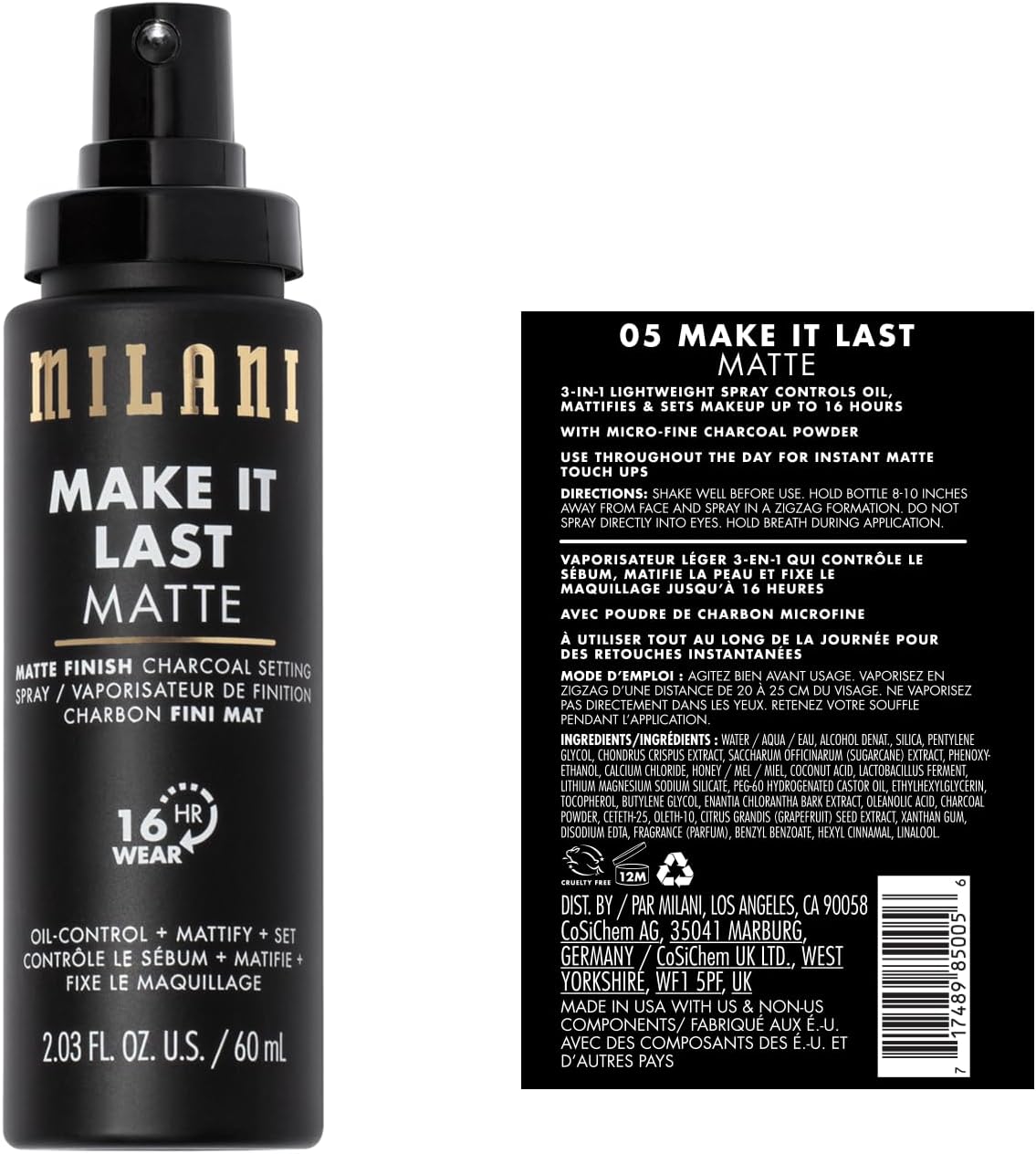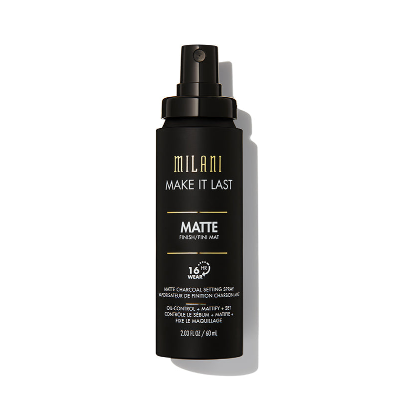 Make your face a no-oil zone! Our Make it Last Charcoal Matte Setting Spray is a real look locker, and it has powerful ingredients to supercharge your skincare routine. After you've made your makeup magnetic, freeze your face for hours with a glam matte finish. This brilliant, oil absorbing setting spray features micro-fine charcoal powder and silica to set makeup and reduce the appearance of pores. This is the ultimate setting spray for oily skin, and it will give your makeup up to 16 hours of just-applied vibe. Contains Evermat and Honey Matte to make your skin look virtually pore-less with a bright, powdery finish. This vegan formula matte finish spray is like a setting spray and blotting paper rolled into one. Milani Make it Last Charcoal Matte Setting Spray is a style setter for striking statements.