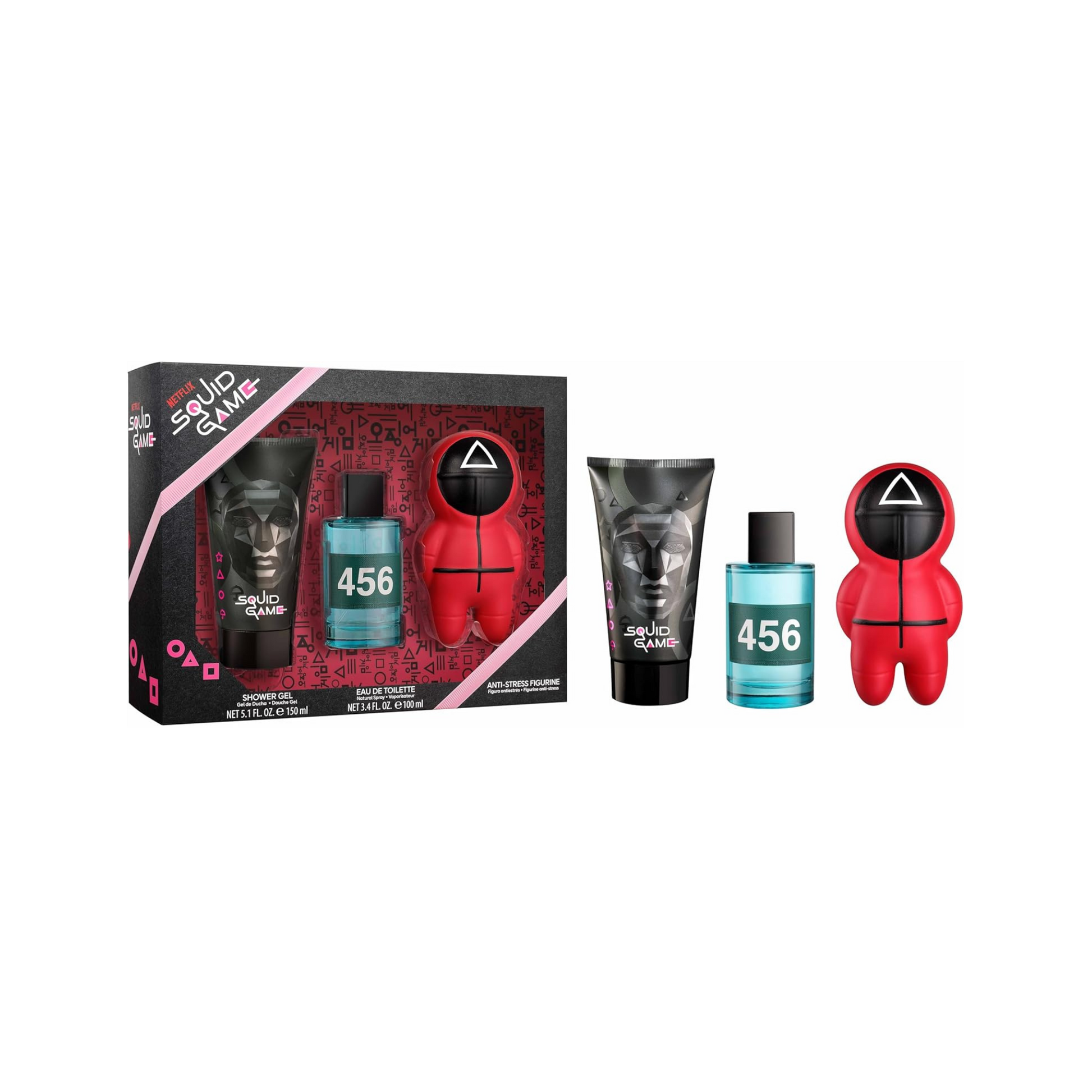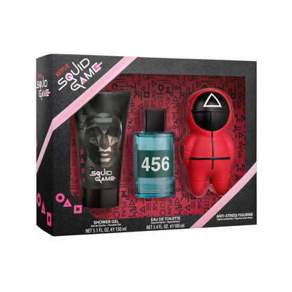 - Design: Sleek, multi-colored rectangular bottle with Squid Game-themed artwork