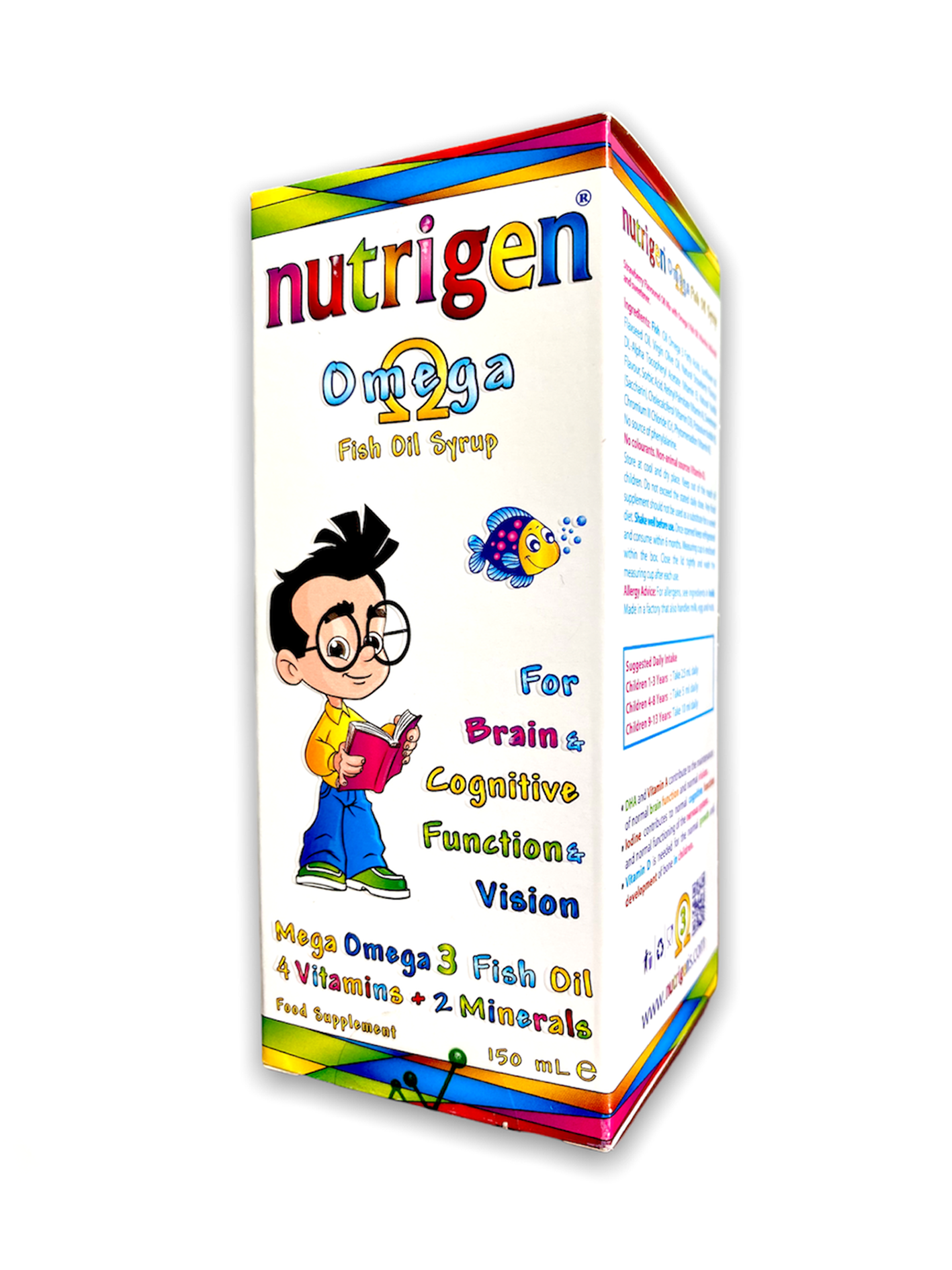 Nutrigen Omega Fish Oil Syrup with vitamins and minerals is formulated with selected amounts of fish oil and the vitamins and minerals that are necessary for ongoing brain development. Nutrigen Omega Fish Oil and Vitamin Mineral Syrup contains EPA and DHA fish oil omega 3 fatty acids, which are essential nutrients that have beneficial effects on brain development and support the body’s systems.