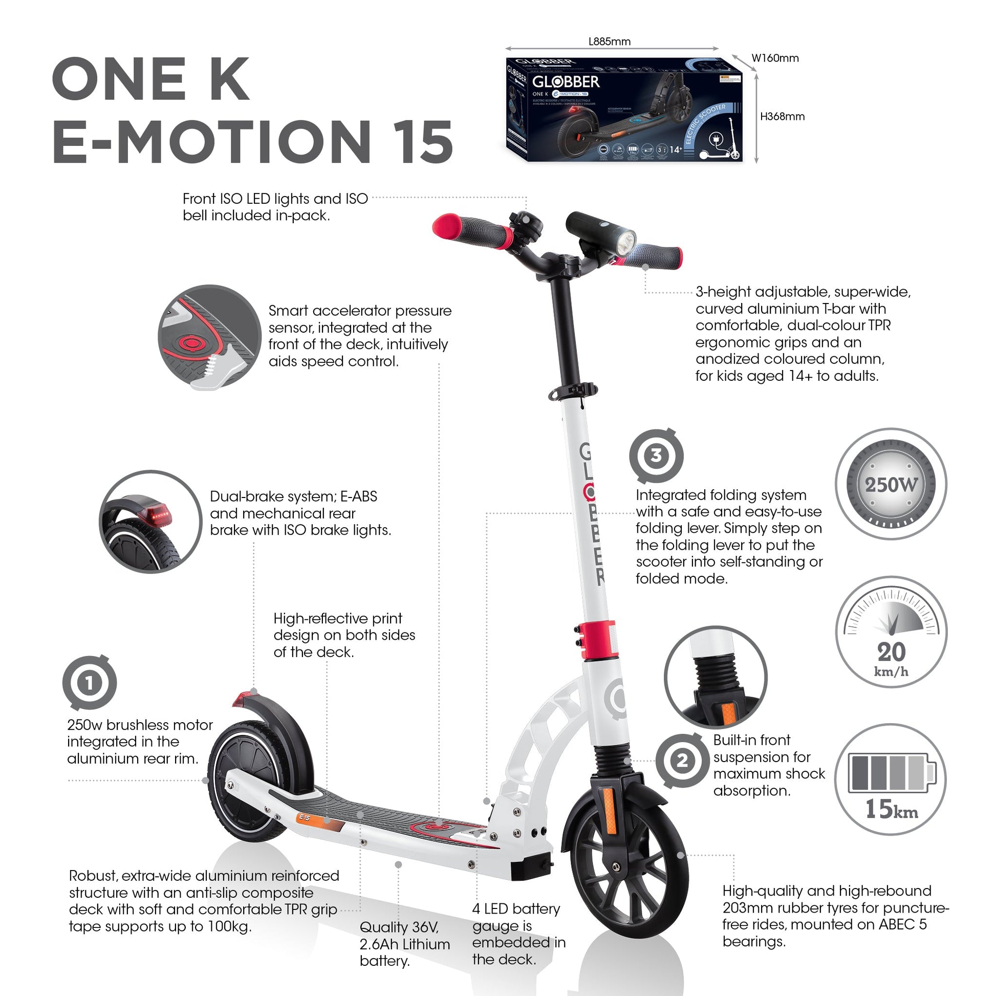 Experience an enhanced riding adventure with the ONE K E-MOTION 15 ELECTRIC SCOOTER. This 2-wheel light-up electric scooter boasts a 250-watt brushless motor and a high-quality 36-volt lithium battery. Its effortless kick-start feature ensures safe and easy rides