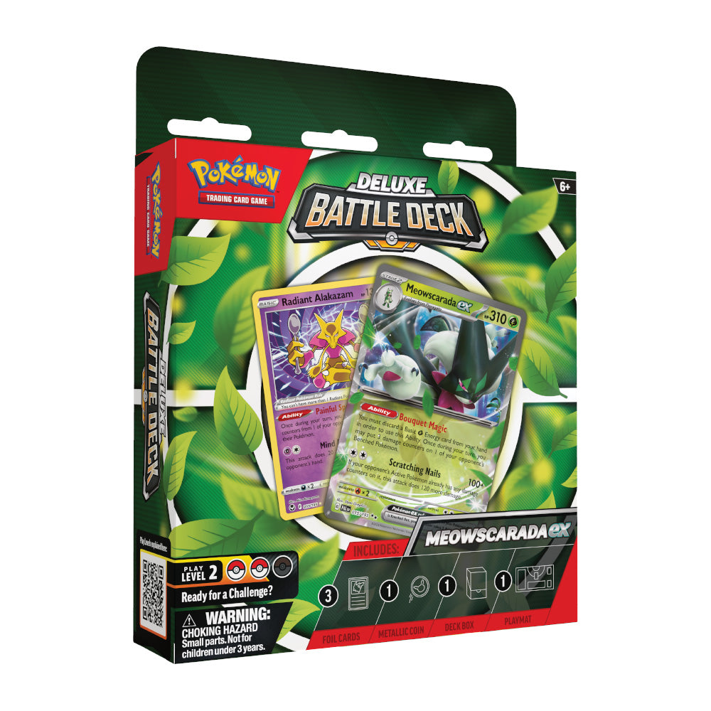 The Pokémon TCG: Meowscarada ex Deluxe Battle Deck include: