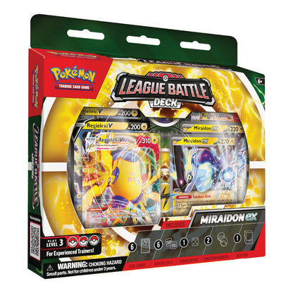 In the Pokémon TCG: Miraidon ex League Battle Deck you will find 1 ready-to-play 60-card deck, 6 damage-counter dice, and 1 coin-flip die.