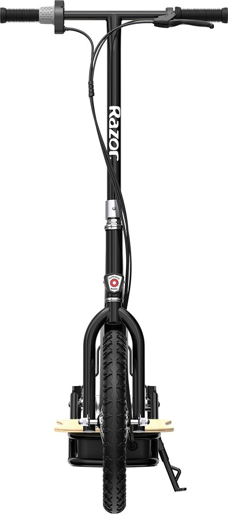 As more people go car-free, going green has never been so stylish with the Razor EcoSmart series electric scooters. Now with this new member to the family, the EcoSmart SUP Electric Scooter offers you a choice to stand up and enjoy the same comfortable ride in style! Its 16" (406 mm) pneumatic tires, and a wide bamboo deck for plenty of foot room, provide a smooth, comfortable ride for neighborhood or cross-campus trips (local laws will apply). This electric scooter, with a 36V lead-acid battery system and plug-in charger, requires no gasoline, making it an economical and eco-friendly alternative to make local trips. With its quiet, high torque, 350-watt hub-driven motor, the Razor EcoSmart SUP Electric Scooter can reach speeds up to 15.5 mph (25 km/h), boasts an up to 15.5mile (25 km) range and up to 60 minutes of continuous use. Whether you're a college student, an eco-conscious adult, or an energetic senior getting to class, running errands or zipping around the neighborhood on the Razor EcoSmart SUP Electric Scooter will quickly become your favorite part of the day. Bring your light to ride it after dark. Maximum user weight: 100kgs