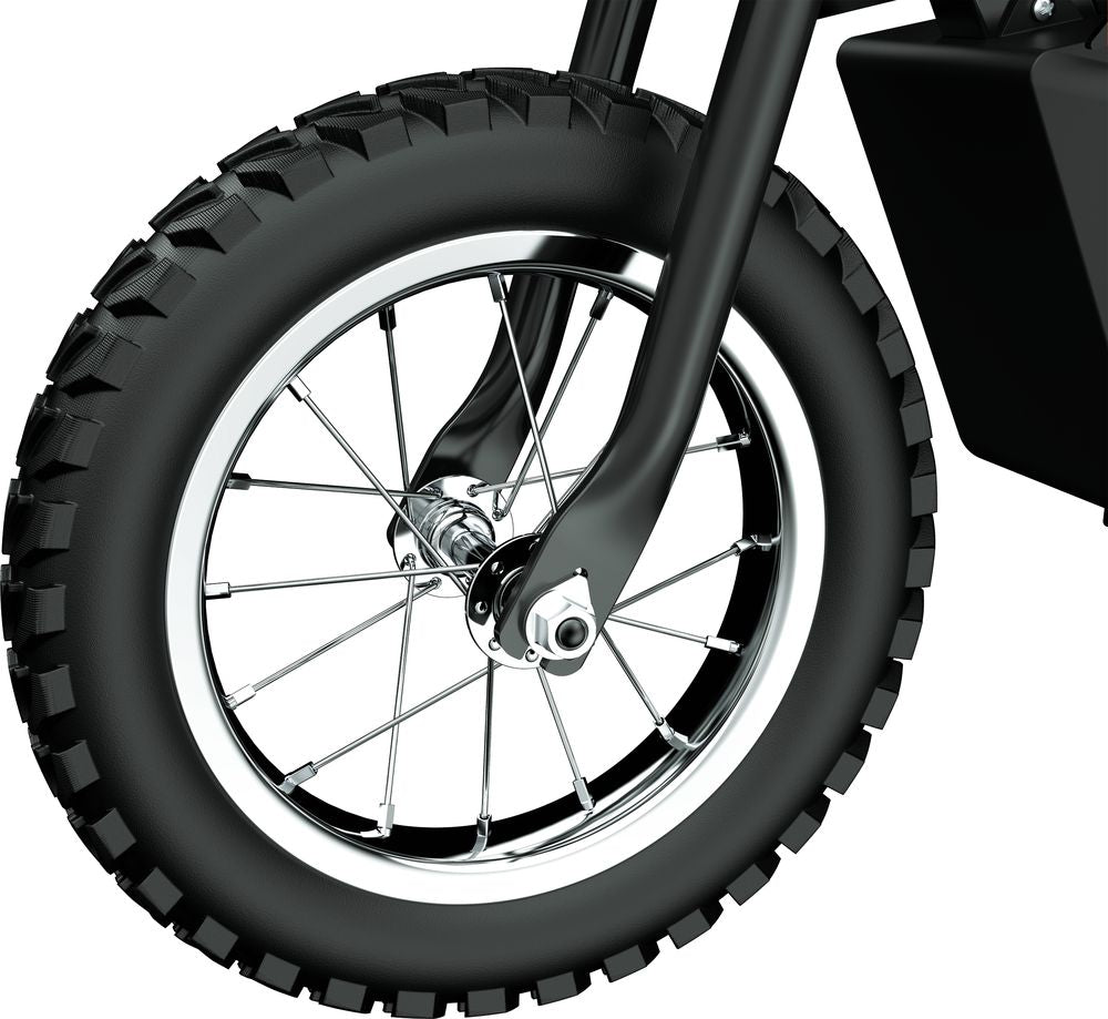 - Designed with motocross dirt bike geometry, knobby tires and twist-grip throttle.