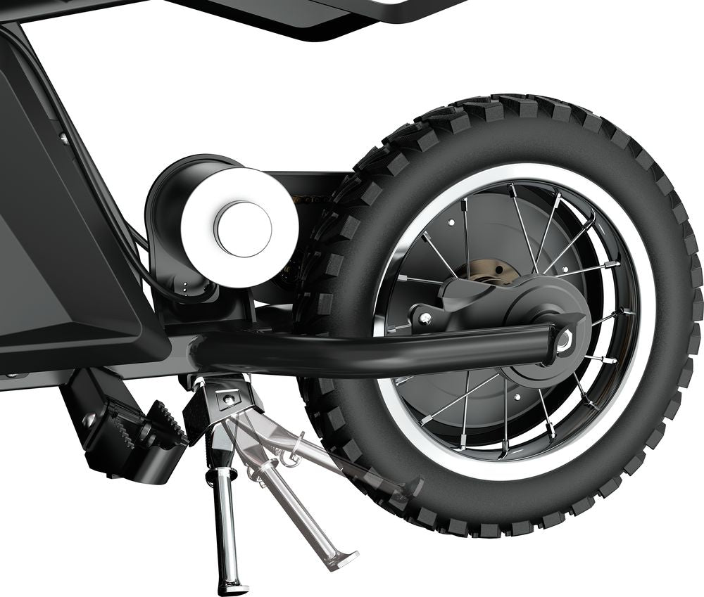 The MX125 Dirt Rocket is your intro to adventure, offering the adrenaline pumping fun of off-road riding in a scaled-down size designed for dirt bike riders ages 7 and up. Razor’s smallest electric-powered dirt bike, the MX125 helps younger riders build confidence on dirt, delivering top-notch performance with authentic MX-frame geometry, motocross-style knobby tires and twist-grip throttle for a true-to-life dirt bike ride. Rear-wheel drive delivers better weight and balance control for greater safety and stability, while the high-torque, chain-driven electric motor powers riders up to 8 mph (13 km/h) for up to 40 minutes of continuous use. It’s the perfect introduction to the excitement and adventure of off-road riding.