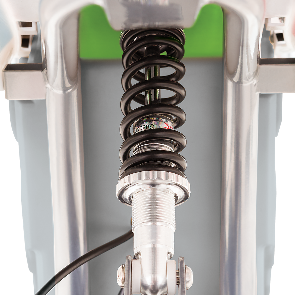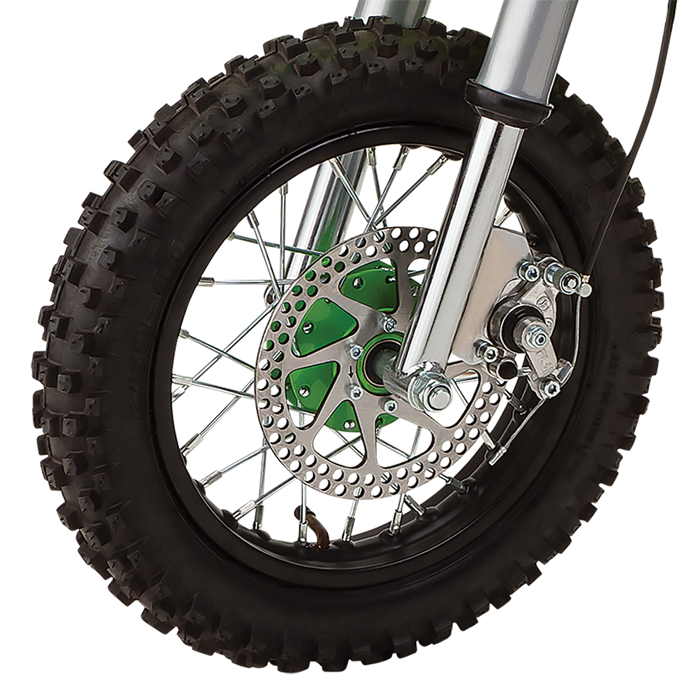 - Motor: Variable-speed, high-torque, chain-driven. Suspension: Dual. Throttle: Twist-grip. Brakes: Hand-operated, dual disc. Frame: Steel. Fork: Double-crown. Fairings: Shatter-resistant plastic. Handlebars: Adjustable-angle, riser-style. Grips: Soft, rubber. Wheels: Motorcycle-spec tires with front- and rear-specific tread.