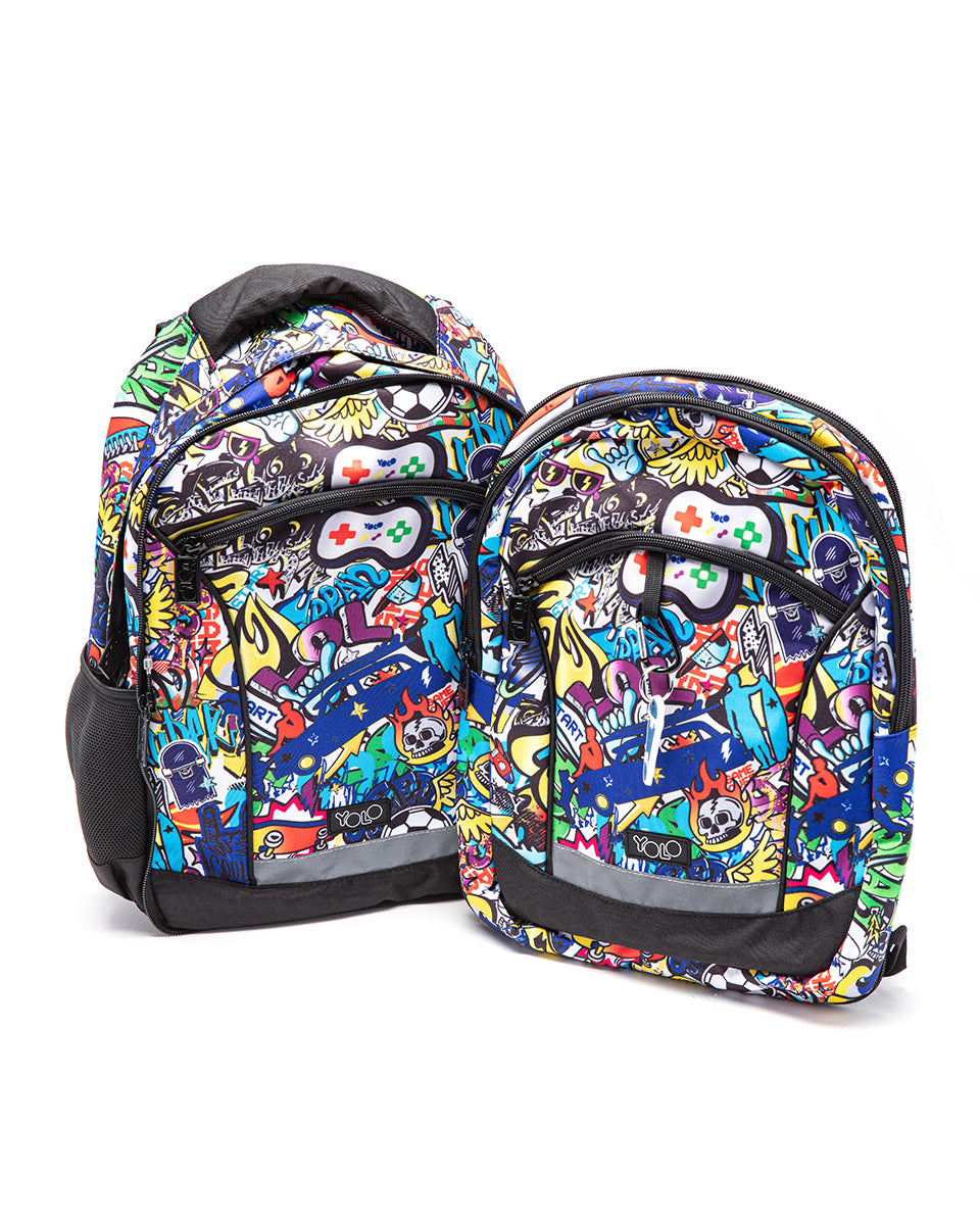 Introducing YOLO's Perfect 2 in 1 School Bag - the ultimate solution for students who crave versatility, comfort, and style! Our innovative 2-in-1 bag is designed to adapt to your needs, offering the flexibility to separate into two distinct bags for lighter or heavier days. Crafted from durable and waterproof fabric, our school bag ensures that your belongings stay safe and dry, regardless of the weather conditions. Say goodbye to worries about unexpected rain showers or accidental spills, as our bag's water-resistant feature provides peace of mind throughout the day. Comfort is key when it comes to carrying heavy loads, and we've got you covered. Our bag features a padded and ventilated back system that not only offers exceptional support but also wicks away sweat, keeping you cool and comfortable during those long school days. Say goodbye to uncomfortable, sweaty backs and hello to ultimate comfort and breathability. Organization is made easy with our thoughtfully designed compartments. The bag boasts three spacious compartments, allowing you to neatly organize your books, notebooks, and other essentials. Plus, with a separate padded area specifically designed to safeguard your laptop, you can transport your technology with peace of mind. Additionally, our bag features a convenient front pocket, providing quick and easy access to smaller items like pens, pencils, and your mobile phone. Need a spot for your water bottle? We've got you covered with two side pockets designed to hold your hydration companion, keeping you hydrated and refreshed throughout the day. With a generous volume of 28 liters and dimensions of 50*35*20cm, our bag offers ample space for all your school essentials and more. No need to worry about cramming everything in or leaving important items behind. We've got you covered with the perfect balance of storage capacity and compact design. Durability and functionality go hand in hand with our high-quality zippers, ensuring smooth and hassle-free operation every time. Rest assured that your belongings will stay secure and protected throughout your daily adventures. Last but not least, our Perfect School Bag features a cool and trendy graffiti design that adds a touch of personal style to your everyday look. Stand out from the crowd with our eye-catching design that is sure to make a statement among your peers. Experience the ultimate combination of functionality, comfort, and style with YOLO's Perfect 2 in 1 School Bag. Don't miss out on this must-have accessory for the modern student. Grab yours today and embrace a hassle-free and stylish school experience like never before!